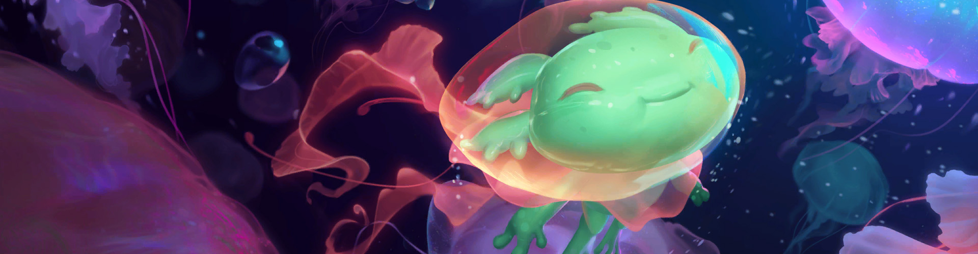 Essa "bolha" não é apenas estética: é também uma extensão vital de sua biologia, permitindo que ele flutue com graça entre correntes aquáticas. Sua cabeça, semelhante à de um axolote, carrega uma expressão constantemente alegre e curiosa, como se estivesse sempre encantado com o mundo ao seu redor.